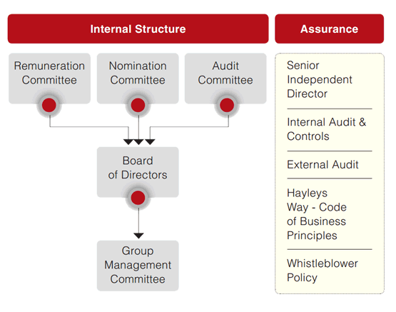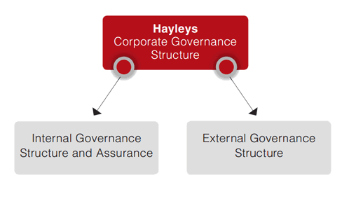 Internal governance encompasses the system of policies, processes and rules created by the Hayleys Board of Directors for the business to follow. It includes the reasons for which the company operates and the roles various stakeholders play in pursuing and achieving those goals. Hayleys internal governance structure and assurance framework is depicted in the following diagram.